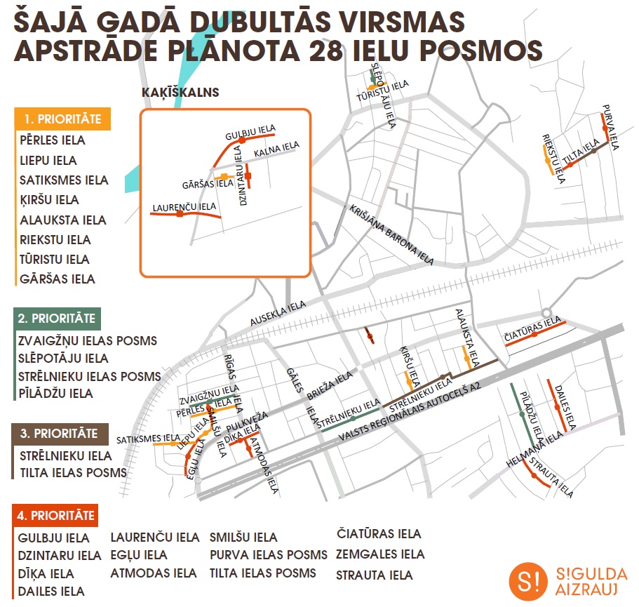 Pirms kāda laika jau informējām, ka šajā būvniecības sezonā, labvēlīgos laikapstākļos, raupju, bet cietajam segumam līdzīgu virskārtas segumu prioritāri iegūs tās ielas, kurās visi īpašumi būs 100% pieslēgti centralizētajiem kanalizācijas tīkliem un centralizētajam ūdensvadam – Alauksta, Ķiršu, Pērles, Liepu, Satiksmes, Gāršas, Riekstu un Tūristu iela. Kā otrā prioritāte ir tās ielas, kurās 100% īpašumu pieslēgti centralizētajiem kanalizācijas tīkliem un 50% (šajā gadījumā vairāk nekā 80%) īpašumu pieslēgti centralizētajam ūdensvadam – Strēlnieku ielas posms no Rūdolfa Blaumaņa līdz Gāles ielai, Zvaigžņu ielas posms no Allažu līdz Rīgas ielai, Pīlādžu, kā arī Slēpotāju iela.