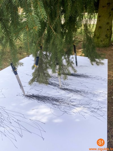“Koki zīmē!” ir mākslas izpausme, ar kuras palīdzību var atrast brīnumaino ikdienišķās parādībās. “Siguldas devons” par savu koku izvēlējās egli. Pie egles zariem piestiprinātās tintes pildspalvas, ļaujoties vēja plūdumam, radīja grafisku zīmējumu. Vējš, kas iekustina koka lapas noteiktā ritmā, veido savu unikālo kustību.