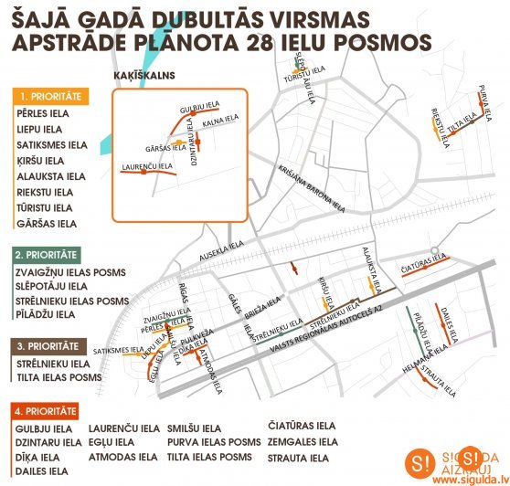 Iestājoties labvēlīgiem laikapstākļiem, norisinās 28 ielu posmu sagatavošana dubultās virsmas apstrādes darbiem. Apauguma noņemšana jau veikta pirmo trīs prioritāšu ielām, un šķembu kārta, kā arī dubultās virsmas kārta tuvākajā laikā tiks ieklāta Ķiršu un Alauksta ielā, kā arī Strēlnieku ielas posmā no Gāles līdz Rūdolfa Blaumaņa ielai. Pārējās ielās notiek secīgi darbi, tostarp ielu apauguma noņemšana 4. prioritātes ielās, kā arī notiek aku remonts un līmeņošana. Dubultās virsmas apstrādes darbus konkursa kārtībā veic būvuzņēmējs SIA “Strauteks”. Uzņēmums paralēli šiem darbiem veic arī bruģa klājuma remontdarbus Siguldas stacijas laukuma strūklakas zonā. Tuvākajās dienās plānots atjaunot bruģa segumu un strūklaka varēs priecēt visus novada iedzīvotājus.