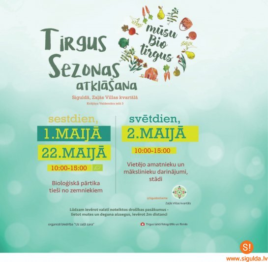 “Mūsu Bio tirgus” maija sākumā Siguldā atklās tirgus sezonu. Lai arī ierobežojumi attiecībā uz piesardzības pasākumiem valstī vēl nav atcelti, ielu tirdzniecība drīkst notikt. Pasākuma organizatori uzsver, ka ir atsevišķi ierobežojumi uz tirgotāju skaitu, tādēļ tirgus notiks divas dienas – 1. un 2. maijā no plkst. 10.00 līdz 15.00. “Mūsu Bio tirgū” būs iespēju tirgoties ražotājiem un iepriecināt iedzīvotājus ar pašmāju ražojumiem. Kā ierasts, tirdziņi norisināsies svaigā gaisā Siguldas pašā centrā – Zaļās Villas kvartālā.