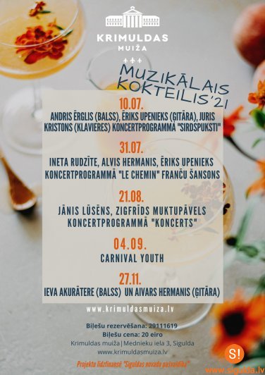 Ieskandinot rehabilitācijas centra “Krimulda” 99 gadu jubileju, 10. jūlijā Krimuldas muiža atklās koncertu ciklu “Muzikālais kokteilis’21”, piedāvājot mūzikas cienītājiem daudzveidīgu skanējumu koncertus vasarā un rudenī. Atklāšanas koncertā apmeklētājus priecēs Andra Ērgļa (balss), Ērika Upenieka (ģitāra) un Jura Kristona (klavieres) koncertprogramma “Sirdspuksti”.