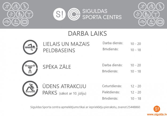 Ņemot vērā to, ka Ūdens atrakciju parks šajā nedēļas nogalē atkal tiks atvērts, Siguldas Sporta centra Spēka zāle un peldbaseins būs pieejams arī svētdienās. Darba laiks svētdienās turpmāk būs no plkst. 10.00 līdz 18.00.