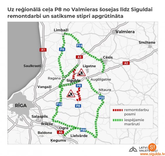 VSIA “Latvijas Valsts ceļi” informē, ka šonedēļ sākušies būvdarbi autoceļa Inciems–Sigulda–Ķegums (P8) posmā no Inciema līdz Turaidai (0,00.-8,303. km) un uz vietējā autoceļa Inciems–Gauja (V89) (0,00.–1,91. km). Darbi turpinās arī šī ceļa posmā no Turaidas līdz krustojumam ar Cēsu ielu Siguldā, kur uzstādīts vēl viens luksofors, līdz ar to satiksme uz šī ceļa ir stipri apgrūtināta. “Latvijas Valsts ceļi” aicina tranzīta autobraucējus neizmantot autoceļu Inciems–Sigulda–Turaida (P8) un nokļūšanai galamērķos izmantot citus maršrutus.