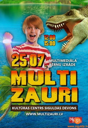 Svētdien, 25. jūlijā, kultūras centrā “Siguldas devons” notiks no 14. marta pārceltā interaktīvā izrāde bērniem “Multizauri”, kas, pielāgojoties valstī noteiktajiem ierobežojumiem, notiks divos laikos – plkst. 12.00 un plkst. 15.00. Apmeklētāji aicināti iepriekš iegādātās biļetes samainīt pret jaunām, izvēloties piemērotāko laiku. Lai samainītu biļetes, aicinām sazināties ar pasākuma organizatoru, rakstot uz e-pasta adresi aeuropa.riga@mail.ru vai zvanot uz tālruņa numuru 28861168.