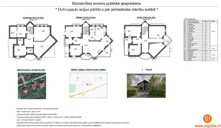 Līdz 23. augustam norisinās publiskā apspriešana par dzīvojamās mājas pārbūvi par privātu pirmsskolas izglītības iestādi Ābeļdārza ielā 15, Siguldā. Siguldas novada Būvniecības kontroles nodaļā, Zinātnes ielā 7, Siguldā, iepriekš piesakoties, zvanot uz tālruņa numuru 67800956 vai rakstot uz e-pasta adresi buvvalde@sigulda.lv, var iepazīties ar būvniecības ieceres dokumentāciju un skaidrojošo aprakstu par iecerēto būvniecības ieceri – dzīvojamās ēkas funkcijas maiņu uz privātu pirmsskolas izglītības iestādi.