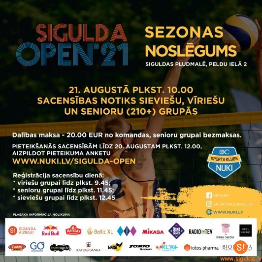 Sestdien, 21. augustā, plkst. 10.00 Siguldas pludmalē norisināsies pludmales volejbola sacensību “Sigulda Open’21” sezonas noslēgums. Sacensības notiks gan sieviešu, gan vīriešu, gan senioru komandu grupās.