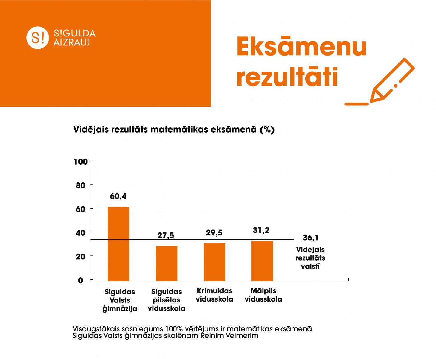 Visaugstākais sasniegums 100% vērtējums ir matemātikas eksāmenā Siguldas Valsts ģimnāzijas skolēnam Reinim Velmerim.
