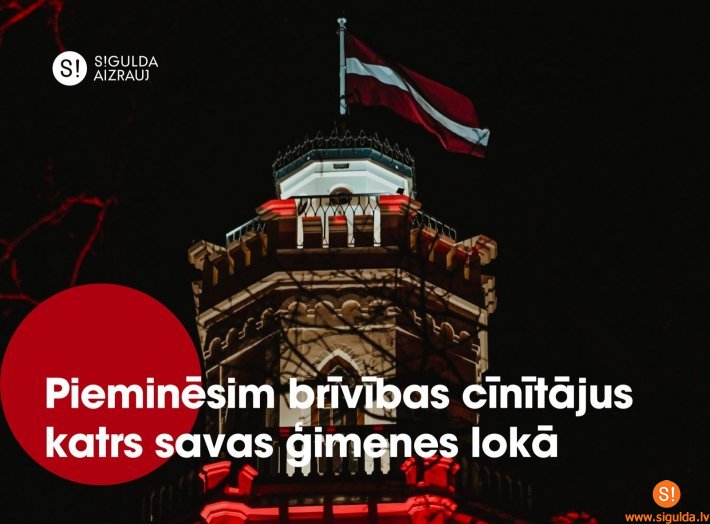 Arī Siguldas “S!” būs tērpies Latvijas karoga krāsās un Siguldas Svētku laukumā, kā arī Siguldas pils kvartālā saposies atgriezīsies tuvākajās dienās! Tāpat dažādā valsts svētku rotā tērpsies objekti citviet novadā. 11. novembrī no plkst. 16.00 līdz 19.30 uz Allažu pamatskolas sienas būs izveidota gaismas instalācija, ko varēs pagūt aplūkot arī no 16. līdz 18. novembrim. Savukārt Lāčplēša dienā pie Mores Tautas nama tiks izgaismotas latvju spēka zīmes un veidots simbolisks gaismas ceļš Mores kauju piemiņas parkā, bet no 11. līdz 18. novembrim pie izgaismotās Mores pamatskolas ēkas speciāli izveidotā vietā būs iespēja novietot un aizdegt svecītes. Līdz 30. novembrim Siguldas pagasta Kultūras nama ieeju rotā vides instalācija “Pacel acis Latvijai”. Tāpat svētku gaismiņas un ziedu kompozīcijas tiks izvietotas Siguldas pilsētas kapsētā, kur atdusas Lāčplēša Kara ordeņa kavalieris Žanis Ķincis, un Pirmā pasaules kara Latvijas brīvības cīņu brāļu kapos Zinātnes ielas un valsts autoceļa A2 krustojumā, kur apbedīti galvenokārt latviešu brīvības cīnītāji, kā arī daži Igaunijas armijas karavīri. Svētku noformējums rotās varoņu piemiņas vietas arī citviet.