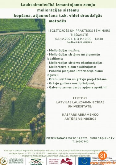 SIA “Latvijas Lauku konsultāciju un izglītības centrs” Pierīgas birojs aicina piedalīties izglītojošā bezmaksas tiešsaistes seminārā “Lauksaimniecībā izmantojamo zemju meliorācijas sistēmu kopšana, atjaunošana videi draudzīgās metodēs”, kas norisināsies 6. decembrī no plkst. 10.00 līdz 16.40 “Zoom” platformā.