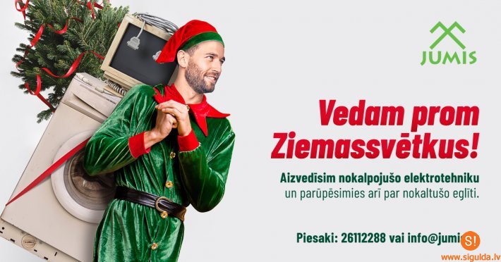 Siguldas pilsētas SIA “JUMIS” klienti eglītes un tehniku bez maksas var nodot šķirošanas laukumā “Zemdegas”, Siguldā. Tāpat bezmaksas elektrotehnikas savākšanu no mājsaimniecībām PSIA “JUMIS” organizēs pēc pieteikuma 31. janvārī. Pēc iepriekšēja pieteikuma Siguldas pilsētas robežās Ziemassvētku eglīšu savākšana tiks nodrošināta arī no mājsaimniecībām. Maksa par eglītes izvešanu ir 3,63 eiro/gab (ar PVN). Pieteikties eglīšu un elektrotehnikas izvešanai PSIA “JUMIS” klienti var, zvanot uz tālruņa numuru 26112288 vai rakstot uz e-pasta adresi info@jumis.lv.