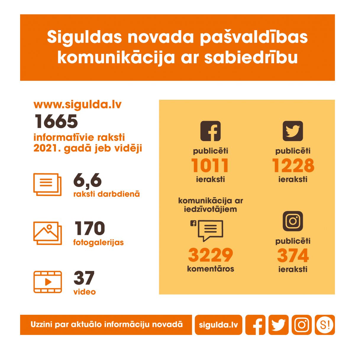 2021. gadā tīmekļa vietnē www.sigulda.lv tika publicēti kopumā 1665 informatīvie raksti par Siguldas novadā aktuālo pārvaldības, infrastruktūras, izglītības, kultūras, sporta un citās sabiedrībai aktuālās jomās. Vidēji pašvaldības tīmekļa vietnē katru darbdienu tiek publicēti 6,6 raksti. Novadā notiekošais tika atainots 170 fotogalerijās un 37 video.