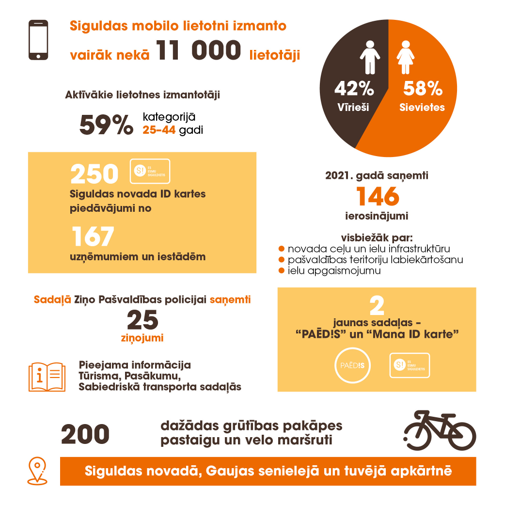 Papildus tam jau vairāk nekā četrus gadus novada iedzīvotājiem un pilsētas viesiem pieejama Siguldas mobilā lietotne, kurā aplūkojama informācija par pašvaldības notikumiem, kultūras, sporta, tūrisma aktualitātēm. Kopumā Siguldas mobilo lietotni 2021. gadā izmantojuši vairāk nekā 11 000 novadnieku un viesu. Aplūkojot pērnā gada statistikas rādītājus, aktīvākie lietotnes izmantotāji – 59% no kopējā skaita – ir vecuma grupā no 25 līdz 44 gadiem. Aktīvāk lietotni izmanto sievietes – 58%.