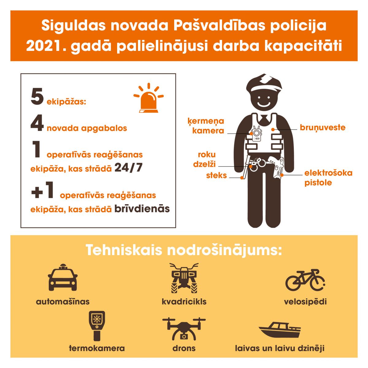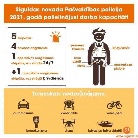 Pašvaldības policija pērn palielinājusi gan inspektoru un patruļu skaitu, gan papildinājusi tehnisko nodrošinājumu. Jaunizveidotais Siguldas novads ir sadalīts četros apgabalos. Katrā no tiem ikdienā strādā vecākais inspektors un inspektors. Tāpat visā novada teritorijā darbojas arī operatīvās reaģēšanas ekipāža, kas strādā 24/7 režīmā. Šī ekipāža ir tā, kas jebkurā diennakts laikā saņem visus Pašvaldības policijā ienākošos zvanus un atbilstoši situācijai pāradresē izsaukumu apgabalu inspektoriem. Papildus tam nedēļas nogalēs tiek nodrošināta vēl viena operatīvās reaģēšanas ekipāža drošības pastiprināšanai attāluma ziņā lielās teritorijas dēļ.