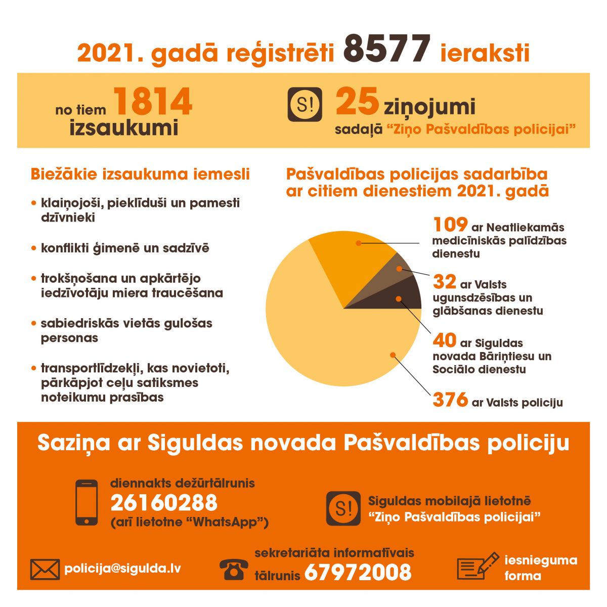 Līdz ar pārraugāmas teritorijas palielināšanos 2021. gadā pieaudzis arī Pašvaldības policijas reģistrēto notikumu skaits. Pērn elektroniskajā datubāzē reģistrēti 8577 ieraksti – tie ir saņemtie iedzīvotāju izsaukumi, darba uzdevumi, veiktās profilaktiskās pārbaudes, palīdzības sniegšanas gadījumi, sadarbība ar dažādām institūcijām un citi ieraksti. No reģistrētajiem ierakstiem 2021. gadā 1814 ir bijuši izsaukumi, kas ir par 205 izsaukumiem vairāk nekā 2020. gadā (1609). Tāpat pērn Pašvaldības policija saņēmusi 25 ziņojumus Siguldas mobilās lietotnes sadaļā “Ziņo Pašvaldības policijai”.