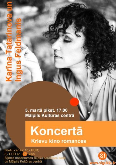 Sestdien, 5. martā, plkst. 17.00 Mālpils Kultūras centrā ar koncertu viesosies Karīna Tatarinova un Ingus Feldmanis. Koncertā klausītājiem tiks uzburta īstena romanču gaisotne, klausoties melodijas no iemīļotām kino klasikas filmām un multfilmām. Aktrises Karīnas Tatarinovas dziedājumu un iedvesmojošos, interesantos stāstus par teātri, kino un pašas dzīvi papildinās ģitārists Ingus Feldmanis.