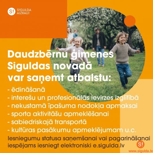 Siguldas novadam paplašinoties pēc administratīvi teritoriālās reformas, daudzbērnu ģimeņu atbalsta programmā iesaistījušās jau 598 ģimenes, kurām šajā gadā izveidots arvien plašāks atbalsta apjoms. Šobrīd noteikumi tām ģimenēm, kurām piešķirts statuss “Siguldas novada pašvaldības ģimene, kuras aprūpē ir trīs un vairāk bērni”, paredz vairākus ieguvumus un atvieglojumus izglītības jomā, bezmaksas ēdināšanu pirmsskolas izglītības iestāžu audzēkņiem un Siguldas novada vispārizglītojošo skolu 5.–12. klašu klātienes skolēniem, nekustamā īpašuma nodokļa atlaides, bezmaksas sabiedrisko transportu, atlaižu programmu novada sporta bāzēs, atlaides kultūras un sporta pasākumiem, kā arī citus atbalsta veidus.
