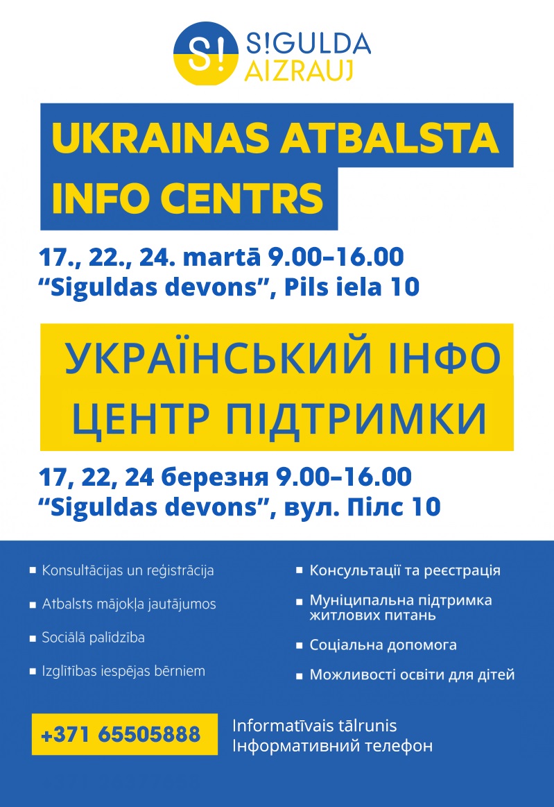Savukārt ceturtdien, 17. martā, no plkst. 9.00 līdz 16.00 Siguldā, Pils ielā 10, kultūras centrā “Siguldas devons” darbosies Ukrainas atbalsta informācijas centrs, kurā Ukrainas kara bēgļiem būs iespējams uzzināt par dažāda veida valsts un pašvaldības piedāvāto palīdzību. Atbalsta centrā tiks sniegtas konsultācijas par pašvaldības sociālo palīdzību un pabalstiem, atbalstu mājokļa nodrošināšanā, nodarbinātību, bērnu izglītības iespējām un sarunvalodas apguvi, kā arī tiks sniegta nepieciešamā informācija vīzu un uzturēšanās atļauju saņemšanai, jo, lai varētu ilglaicīgi uzturēties un strādāt Latvijā, Ukrainas pilsoņiem jāsaņem ilgtermiņa vīzas, kurām iespējams pieteikties Pilsonības un migrācijas lietu pārvaldes (PMLP) filiālēs Rīgā vai Cēsīs.