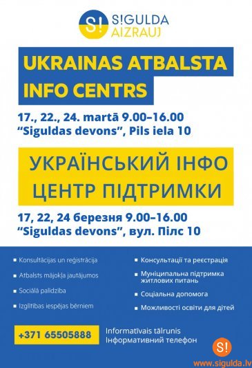 Savukārt ceturtdien, 17. martā, no plkst. 9.00 līdz 16.00 Siguldā, Pils ielā 10, kultūras centrā “Siguldas devons” darbosies Ukrainas atbalsta informācijas centrs, kurā Ukrainas kara bēgļiem būs iespējams uzzināt par dažāda veida valsts un pašvaldības piedāvāto palīdzību. Atbalsta centrā tiks sniegtas konsultācijas par pašvaldības sociālo palīdzību un pabalstiem, atbalstu mājokļa nodrošināšanā, nodarbinātību, bērnu izglītības iespējām un sarunvalodas apguvi, kā arī tiks sniegta nepieciešamā informācija vīzu un uzturēšanās atļauju saņemšanai, jo, lai varētu ilglaicīgi uzturēties un strādāt Latvijā, Ukrainas pilsoņiem jāsaņem ilgtermiņa vīzas, kurām iespējams pieteikties Pilsonības un migrācijas lietu pārvaldes (PMLP) filiālēs Rīgā vai Cēsīs.
