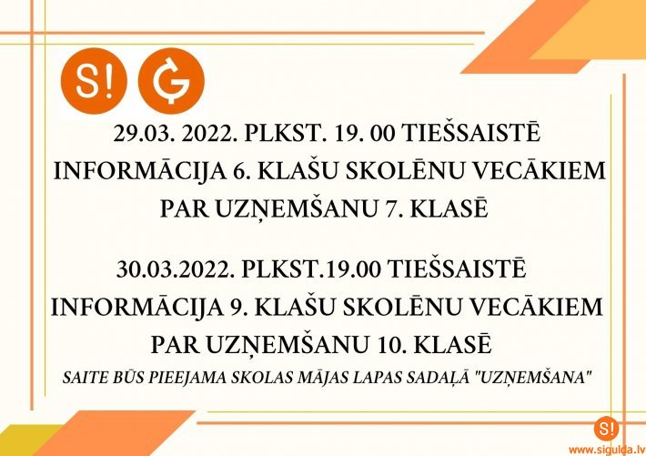Siguldas Valsts ģimnāzija 29. martā plkst. 19.00 aicina 6. klašu skolēnu vecākus uz tikšanos informatīvā tiešsaistē par uzņemšanu 7. klasē.
