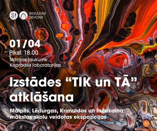 Siguldas dzelzceļa stacijas laukuma koprades laboratorijās piektdien, 1. aprīlī, plkst. 18.00 tiks atklāta Siguldas novada mākslu skolu izstāde “TIK un TĀ”. Ekspozīcijās ar savu radošo un pedagoģisko darbību dalīsies Inčukalna Mūzikas un mākslas skola, Krimuldas Mūzikas un mākslas skola, Maijas Pīlāgas Lēdurgas Mākslas skola un Mālpils Mūzikas un mākslas skola. Aprīlī turpinām ieraudzīt talantus tepat mums līdzās, Siguldas novadā.