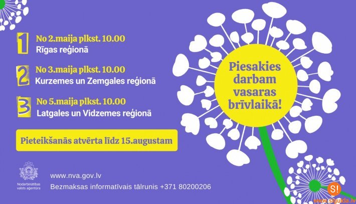 Nodarbinātības valsts aģentūras (NVA) mājaslapā uzsākusies skolēnu elektroniskā reģistrācija dalībai NVA īstenotajā skolēnu vasaras nodarbinātības pasākumā Rīgas reģionā, tostarp Siguldas novadā. Šajā nodarbinātības projektā darbavietām var pieteikties skolēni vecumā no 15 līdz 20 gadiem. Pieteikšanās norisinās Nodarbinātības valsts aģentūras tīmekļa vietnē www.nva.gov.lv.