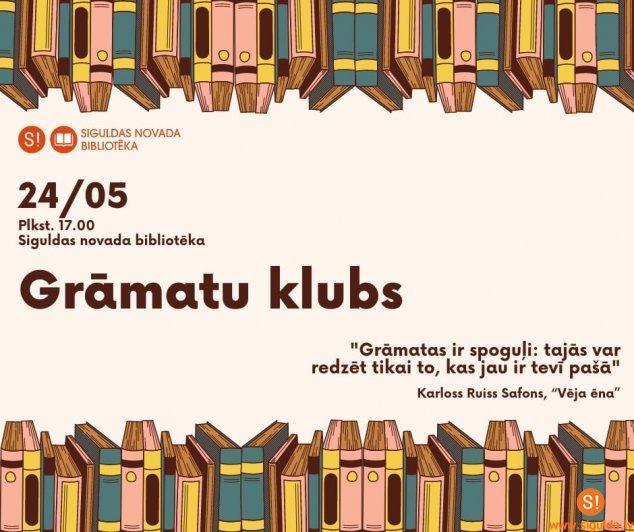 Siguldas novada bibliotēkas grāmatu klubs aicina ļauties lasītpriekam un pievienoties otrajai tikšanās reizei 24. maijā plkst. 17.00, lai dalītos iespaidos par izlasīto.