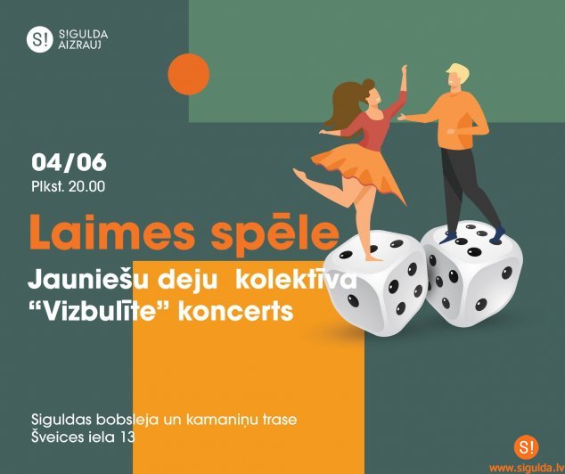 4. jūnijā plkst. 20.00 jauniešu deju kolektīvs “Vizbulīte” aicina uz koncertu “Laimes spēle”. Koncerts notiks pie bobsleja un kamaniņu trases “Sigulda” Šveices ielā 13, Siguldā.