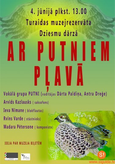 4. jūnijā plkst. 13.00 Turaidas muzejrezervāta dziesmu dārzā notiks brīvdabas koncerts “Ar putniem pļavā”. Brīvdabas koncertā iesaistīsies vokālā grupa “Putni”, komponiste Madara Pētersone, saksofonists Arvīds Kazlausks, pūšaminstrumentāliste Ieva Nīmane, rakstnieks un putnu fotogrāfs Rvīns Varde.