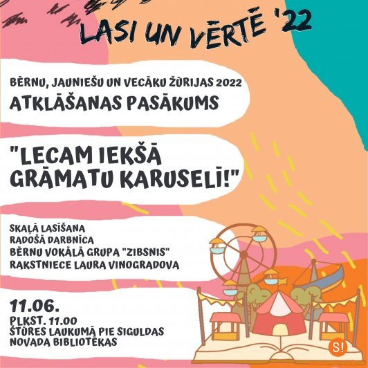 11. jūnijā plkst. 11.00 pie Siguldas novada bibliotēkas Štūres laukumā norisināsies “Bērnu, jauniešu un vecāku žūrijas” 2022. gada grāmatu kolekcijas atklāšanas pasākums “Lecam iekšā grāmatu karuselī!”.