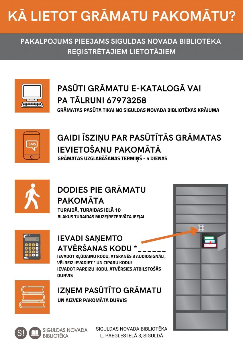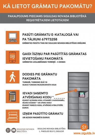 Reģistrētie bibliotēkas lietotāji, zvanot uz tālruņa numuru 67973258 vai apmeklējot Siguldas novada bibliotēkas elektronisko katalogu, var pasūtīt grāmatas un citus iespieddarbus un jebkurā diennakts laikā saņemt tos grāmatu pakomātā bezkontakta režīmā, kā arī nodot grāmatas grāmatu nodošanai paredzētajā nodalījumā.