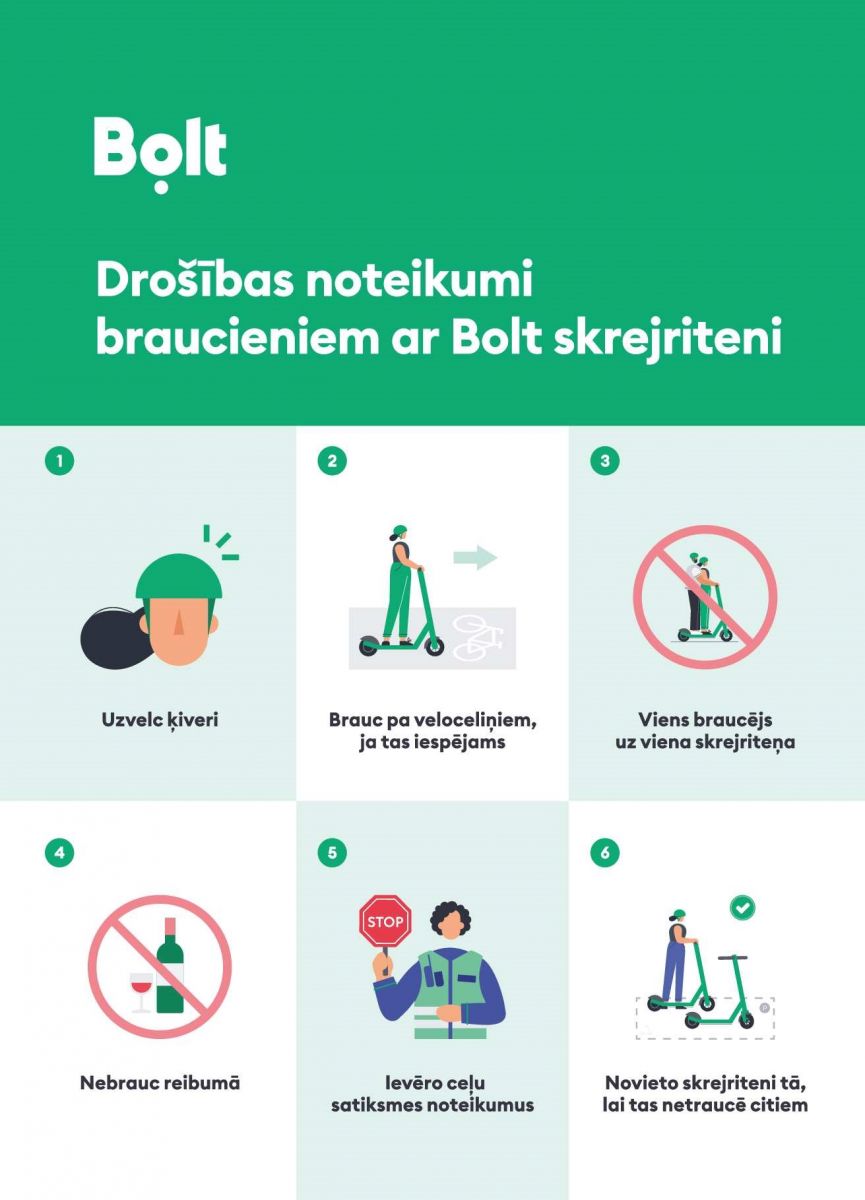 Elektriskie skrejriteņi ir videi draudzīgs pārvietošanās veids, kas īpaši piemērots pilsētvidē. Tomēr, pārvietojoties ar skrejriteni, ir ļoti būtiski rūpēties par drošību, lai visi satiksmes dalībnieki varētu pārvietoties netraucēti. “Bolt” skrejriteņu nomas lietotnē pirms brauciena uzsākšanas katram ir iespēja iepazīties ar drošības ceļvedi. Lai tam piekļūtu, lietotājiem jāpārslēdz “Bolt” lietotne uz skrejriteņu režīmu un ekrāna apakšējā labajā pusē jāizvēlas vairoga ikona. Šāda ikona izveidota, jo viena no uzņēmuma “Bolt” misijām ir izglītot skrejriteņu lietotājus un veidot izpratni par drošu skrejriteņu lietošanu. Tāpat viens no drošības risinājumiem ir iespēja lietotnē izvēlēties Iesācēja režīmu, ja skrejriteni izmanto pirmo reizi.