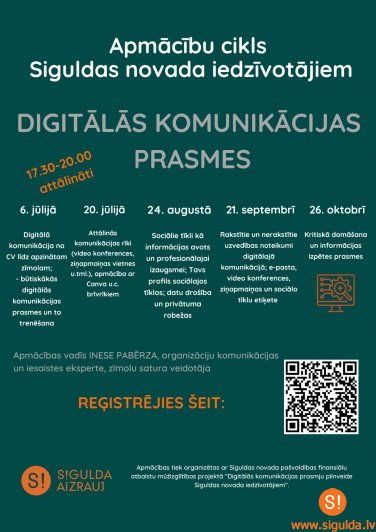 Jau ziņots, ka, nolūkā uzlabot digitālās komunikācijas prasmes, Siguldas novadā norisinās piecu bezmaksas nodarbību cikls, piedāvājot ikvienam interesantam neatkarīgi no vecuma, izglītības vai sociālā stāvokļa, ērti un pieejami apgūt jaunas, praksē izmantojamas zināšanas un rīkus. Ir iespēja reģistrēties un piedalīties atsevišķās nodarbībās. Taču dalībnieki, kuri apmeklēs visas piecas nodarbības, noslēgumā saņems apliecinājumu par visa kursa apguvi.