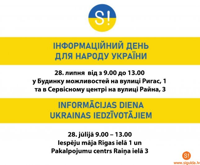 28. jūlijā no plkst. 9.00 līdz 13.00 Siguldas Iespēju mājā Rīgas ielā 1 darbosies Ukrainas iedzīvotāju atbalsta informācijas centrs, kurā patvēruma meklētājiem no Ukrainas būs iespējams uzzināt par dažāda veida valsts un pašvaldības piedāvāto palīdzību. Tāpat šajā dienā Pakalpojumu centrā Raiņa ielā 3 Ukrainas civiliedzīvotāji, kuriem jau ir vīzas, varēs saņemt Latvijā izdotus personas kodus.