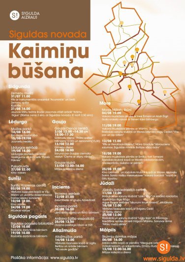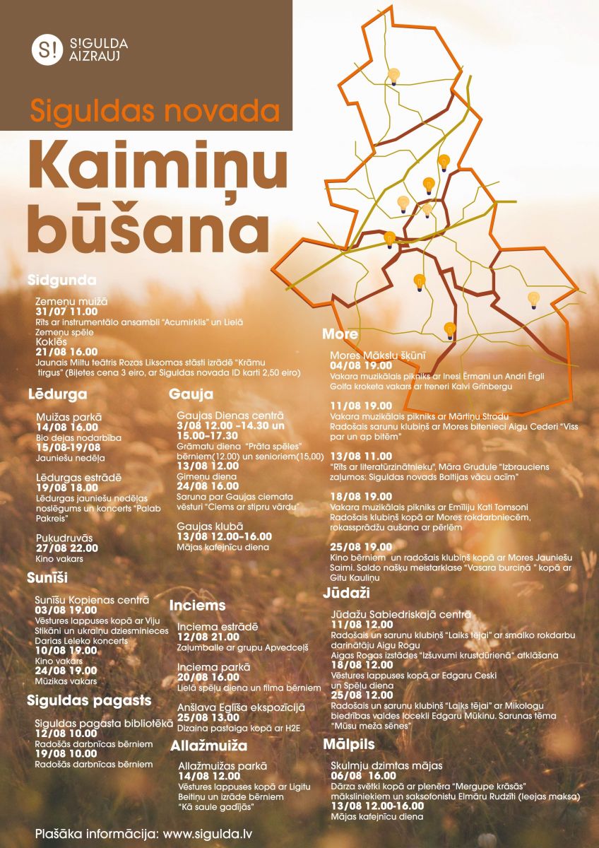 Siguldas novada ID karti – 2,50 eiro). 24. augustā plkst. 16.00 Gaujas Dienas centrā gaidāma saruna par Gaujas ciemata vēsturi, bet plkst. 19.00 – muzikālais vakars Sunīšos. 25. augustā plkst. 12.00 Jūdažos notiks radošā un sarunu klubiņa “Laiks tējai” tikšanās ar Mikologu biedrības valdes locekli Edgaru Mūkinu. Sarunas tēma – “Mūsu meža sēnes”. Plkst. 13.00 Inciemā paredzēta dizaina pastaiga kopā ar “H2E”, piedāvājot apmeklēt Anšlava Eglīša ekspozīciju. Turklāt Inciemā augustā varēs piedalīties nūjošanas, kā arī mašīnizšūšanas nodarbībās. Tāpat 25. augustā plkst. 19.00 Morē gaidāms kino vakars bērniem, radošais klubiņš kopā ar Mores jauniešu saimi un saldo našķu “Vasara burciņā” meistarklase ar Gitu Kauliņu. Savukārt 27. augustā plkst. 22.00 Lēdurgas “Puķudruvās” risināsies kino vakars un būs arī zaļumballe.