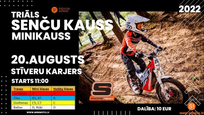 Sestdien, 20. augustā, Latvijas Valsts mežu karjerā, kas atrodas Allažu pagasta “Silciema masīvā”, norisināsies “Minikausa” un “Senču kausa” triāla sacensības bērniem un viņu vecākiem. Sacensības pulcēs “Motokluba Sigulda” jaunos sportistus, kā arī triālistus no Jelgavas, Ķekavas, Ropažu, Carnikavas novada un Rīgas.