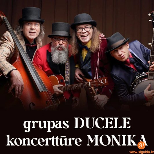 Koncertuzvedumā “Monika” piedalās grupas “Ducele” mūziķi Arnis Veibārdis (balss, ģitāra), Andris Alviķis (balss, kontrabass, perkusijas), Artūrs Uškāns (balss, akordeons, kokle, stabules, mutes ermoņikas) un Mārcis Kalniņš (bandžo, buzuki, ģitāra). Scenārijs un režija – Viktors Runtulis.
