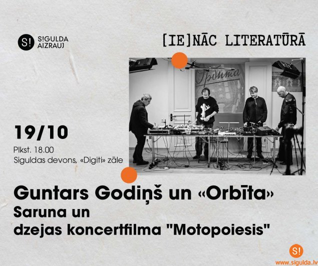 19. oktobrī plkst. 18.00 kultūras centra “Siguldas devons” Digiti zālē notiks sarunu cikla “[Ie]nāc literatūrā” rudens sezonas pirmais pasākums. Tajā dzejnieks Guntars Godiņš uz sarunu aicinājis apvienības “Orbīta” pārstāvjus, kuriem nupat klajā nākusi dzejas koncertfilma “Motopoiesis”. Pēc sarunas notiks filmas seanss.