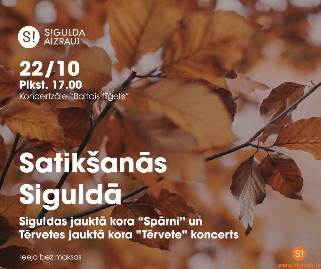 22. oktobrī plkst. 17.00 koncertzālē “Baltais flīģelis” gaidāms kormūzikas koncerts “Satikšanās Siguldā”.