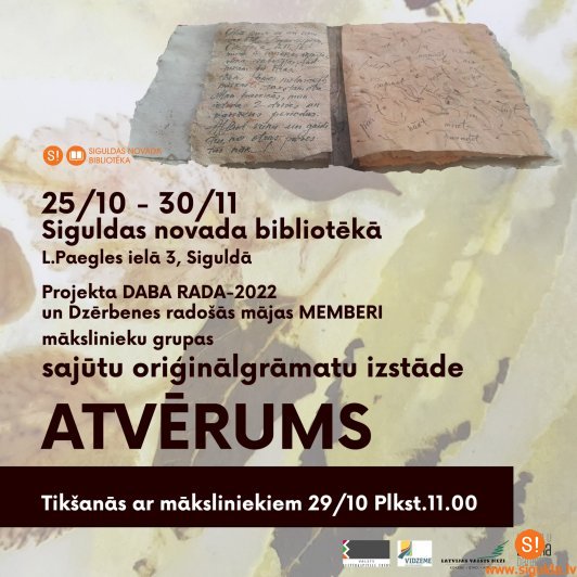 Siguldas novada bibliotēka aicina aplūkot sajūtu grāmatu izstādi “Atvērums”, kurā darbi tapuši projekta “Daba rada 2022” laikā. Izstāde bibliotēkā būs skatāma līdz 30. novembrim. Tikšanās ar māksliniecēm notiks 29. oktobrī plkst. 11.00.