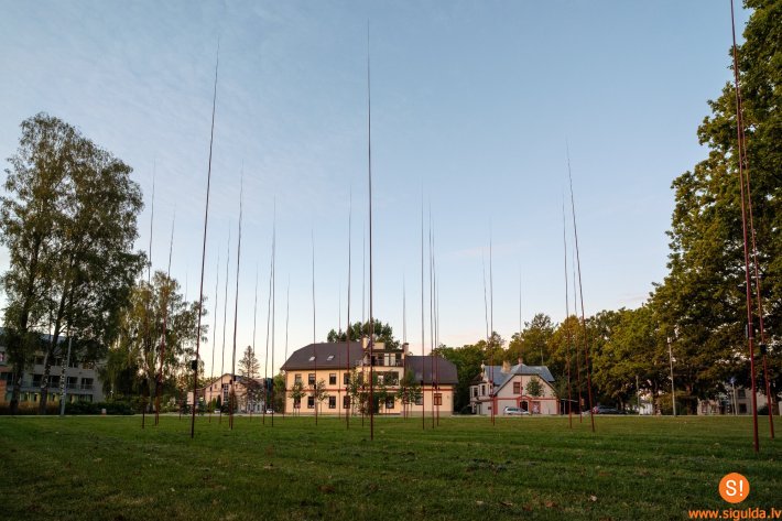 Līdz oktobra beigām zālienā pie kultūras centra “Siguldas devons” apskatāma mākslinieku apvienības “Orbīta” veidota skaņas un gaismas instalācija “No ētera”.