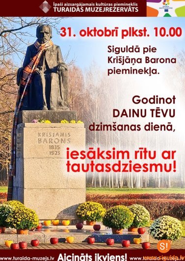31. oktobra rītā plkst.10.00 Turaidas muzejrezervāts aicina pulcēties pie Krišjāņa Barona pieminekļa Siguldā, lai rītu sāktu ar tautasdziesmu.