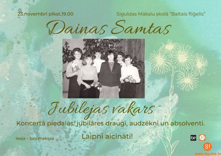 Visi laipni aicināti 23. novembra vakarā Siguldas koncertzālē “Baltais flīģelis”, lai svinētu skolotājas Dainas Samtas skaisto, apaļo dzīves jubileju un teiktu paldies par daudzpusīgo un bagāto ieguldījumu mākslu skolai “Baltais flīģelis”.
