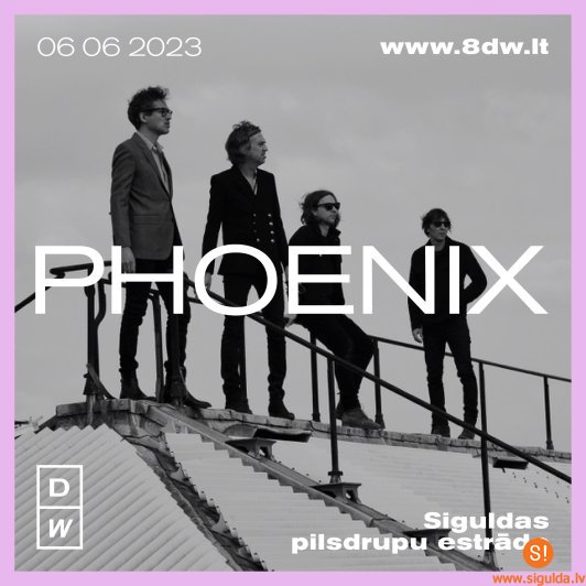 “Phoenix” ir viena no šā gadsimta ievērojamākajām indie grupām, kas dibināta 2000. gadu sākumā. Grupas dalībnieki: vokālists Tomass Marss, ģitāristi un brāļi Lorāns Brenkovics un Kristians Mazzalai, kā arī basģitārists-taustiņinstrumentālists Deks D’Arsijs. Debijas albums “United”, kas iznāca 2000. gadā, ierindoja grupu nozīmīgāko indie izpildītāju sarakstā. Melodiju kvalitāte, dziesmu noskaņas un skanējums – vislabāk raksturo grupas jauno albumu “Alpha Zulu”. Koncertā izskanēs dziesmas no jaunā albuma, papildinot skaņdarbus ar jau labi zināmiem darbiem.