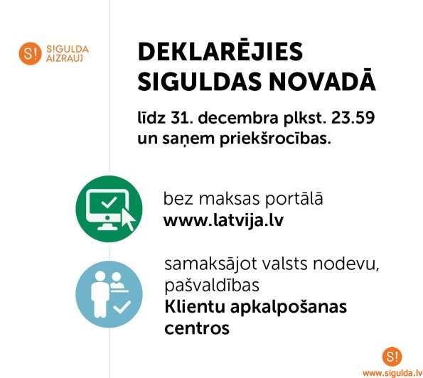 Jau vairākus gadus Siguldas novada pašvaldība turpina attīstīt atbalsta sistēmu Siguldas novadā deklarētajiem iedzīvotājiem. Novadā deklarētajiem ir pieejama plaša atbalsta programma ģimenēm un Siguldas novada ID karšu programmas piedāvājums. Lai nākamgad saņemtu pilnu atbalsta programmu, iedzīvotāji, kuri vēl nav deklarējušies novadā, ir aicināti to izdarīt līdz šā gada 31. decembrim.