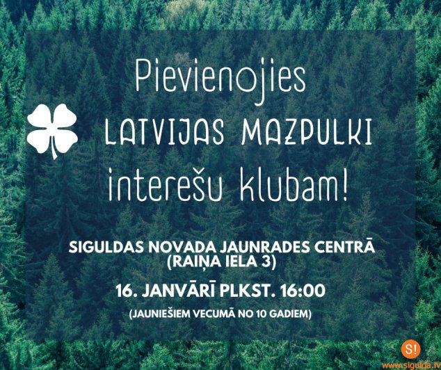 Siguldas novada Jaunrades centra jauniešu iniciatīvu centrs “Mērķis” aicina jauniešus pievienoties Latvijas mazpulku (“4H club”) interešu klubam. Pirmā tikšanās notiks 16. janvārī plkst. 16.00 Siguldas novada Jaunrades centrā (Raiņa iela 3). Pieteikties aicināti jaunieši no 10 gadu vecuma (interešu klubu vadīs Arnita Čoiča).