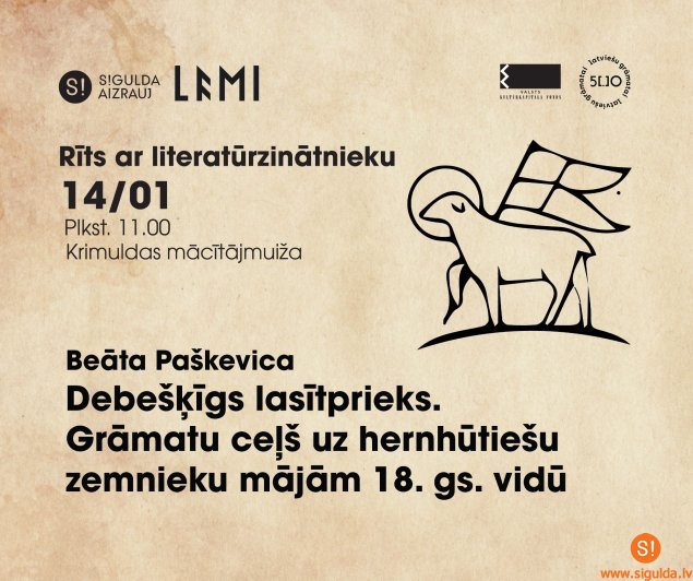 Pirmajā cikla pasākumā “Debešķīgs lasītprieks. Grāmatu ceļš uz hernhūtiešu zemnieku mājām 18. gadsimta vidū” Dr. phil. Beata Paškevica stāstīs par grāmatu ceļu uz hernhūtiešu zemnieku mājām. Tieši hernhūtiešu darbība latviešos modināja interesi par lasāmvielu kā derīgu un arī pacilājošu nodarbi. Tikšanās notiks sestdien, 14. janvārī, plkst. 11.00 Krimuldas baznīcas mācītājmuižā.