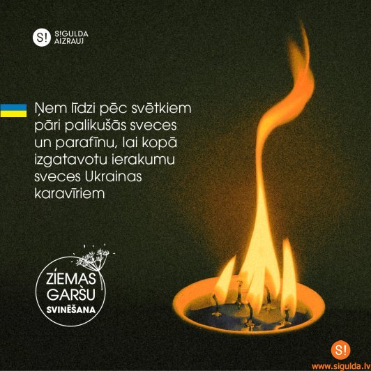 Ikviens gardēžu festivāla “Ziemas garšu svinēšana” dalībnieks ir aicināts apmeklēt pasākumu, kas norisināsies jau šajā sestdienā, 28. janvārī, līdzi ņemot pēc svētkiem pāri palikušās sveces un parafīnu, lai kopā ar Siguldas novada jauniešu iniciatīvu centra “Mērķis” dalībniekiem izgatavotu ierakumu sveces, kas tiks nogādātas uz Ukrainu.