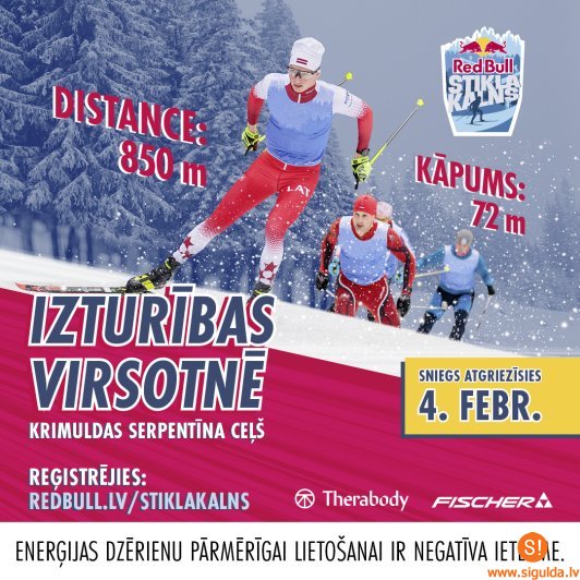 Krimuldas serpentīna ceļā organizētās unikālā formāta distanču slēpošanas sacensības “Red bull Stikla kalns”, kas norisināsies jau otro gadu pēc kārtas. Slēpošanai neatbilstošas laika prognozes dēļ sacensības tika pārceltas no 28. janvāra uz šo sestdienu, 4. februāri. Sacensību organizatori informē, ka gājēju pārvietošanās pa Krimuldas serpentīna ceļu būs ierobežota visas dienas garumā, taču vērš uzmanību, ka no plkst. 14.00 līdz 20.00 gājēju kustība šajā posmā nebūs atļauta.