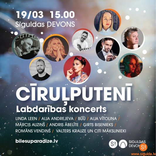 Dziedātājas Linda Leen, Būū, Aija Andrejeva, Aija Vītoliņa un citi izcili Latvijas solisti, mūziķi Mārcis Auziņš, Andris Ābelīte un Romāns Vendiņš, dejotājs Ģirts Bisenieks, kā arī citi skatuves mākslinieki sadarbībā ar kultūras centru “Siguldas devons” sirdssiltā koncertā mudinās cilvēkus labās domas vairot kā sniegpārslas cīruļputenī.