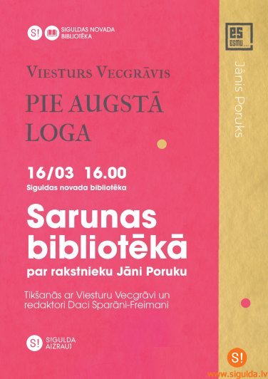 16. martā plkst. 16.00 Siguldas novada bibliotēkā norisināsies tikšanās ar novadnieku literatūrvēsturnieku Dr. philol.Viesturu Vecgrāvi un redaktori Daci Sparāni-Freimani – sarunas par latviešu dzejnieku Jāni Poruku un viņam veltīto monogrāfiju “Pie augstā loga”, kas janvārī iznākusi romānu un monogrāfiju sērijā “Es esmu…”.